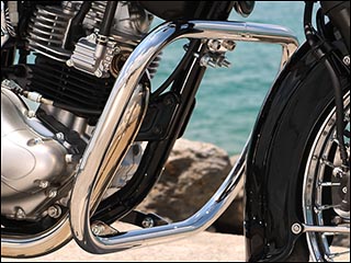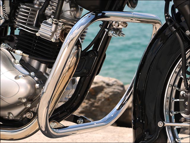 磨き上げられたステンレス31.8mm径パイプは迫力の見た目と、万が一の転倒時には車体のダメージを軽減するフロントバンパー。