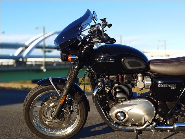 わたしは元々乗っていたW650にも20年間ほどガイラシールドを装着させていただいており、その効果のほどは実際に体感済みではありましたが、いざ、改めてボンネビルに装着してみると、その風防効果の絶大さを改めて体感することができました。