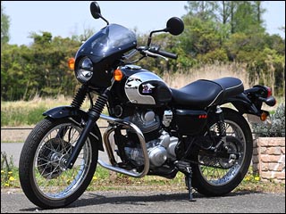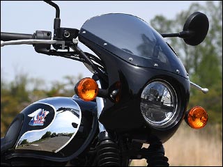 | メグロS1/230用新型ビキニカウル『トラッドワン』新発売 - 2026/04/23 | 小径ヘッドライトに適合するトラディショナルなフォルムの新型ビキニカウルが登場。 主張しすぎない柔らかなフォルムが、ノスタルジックな気品と躍動感をバランス良く演出します。 空力性能の向上によりツーリングシーンの走りの質を一段上へと引き上げます。 ヘッドライトやメーターなどへカウル本体を沿わせることで、シンプルな左右2点ラバーマウントながらもガタ付きのない取り付けを実現しました。 カウル本体は耐久性を重視したFRP多層構造で艶のある黒ゲルコート仕上げ、裏面はサフェースマットの黒塗装仕上げとなります。