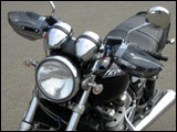十分な強度をもたせた取付けステーは高い風圧を受けてもガタツキが出ないように考慮された形状を持ち、左右のミラーに共締めするだけのボルトオン設計です。 ※ 取付けステーはブラック塗装仕上げとなります(クロームメッキ仕上げは生産終了)。